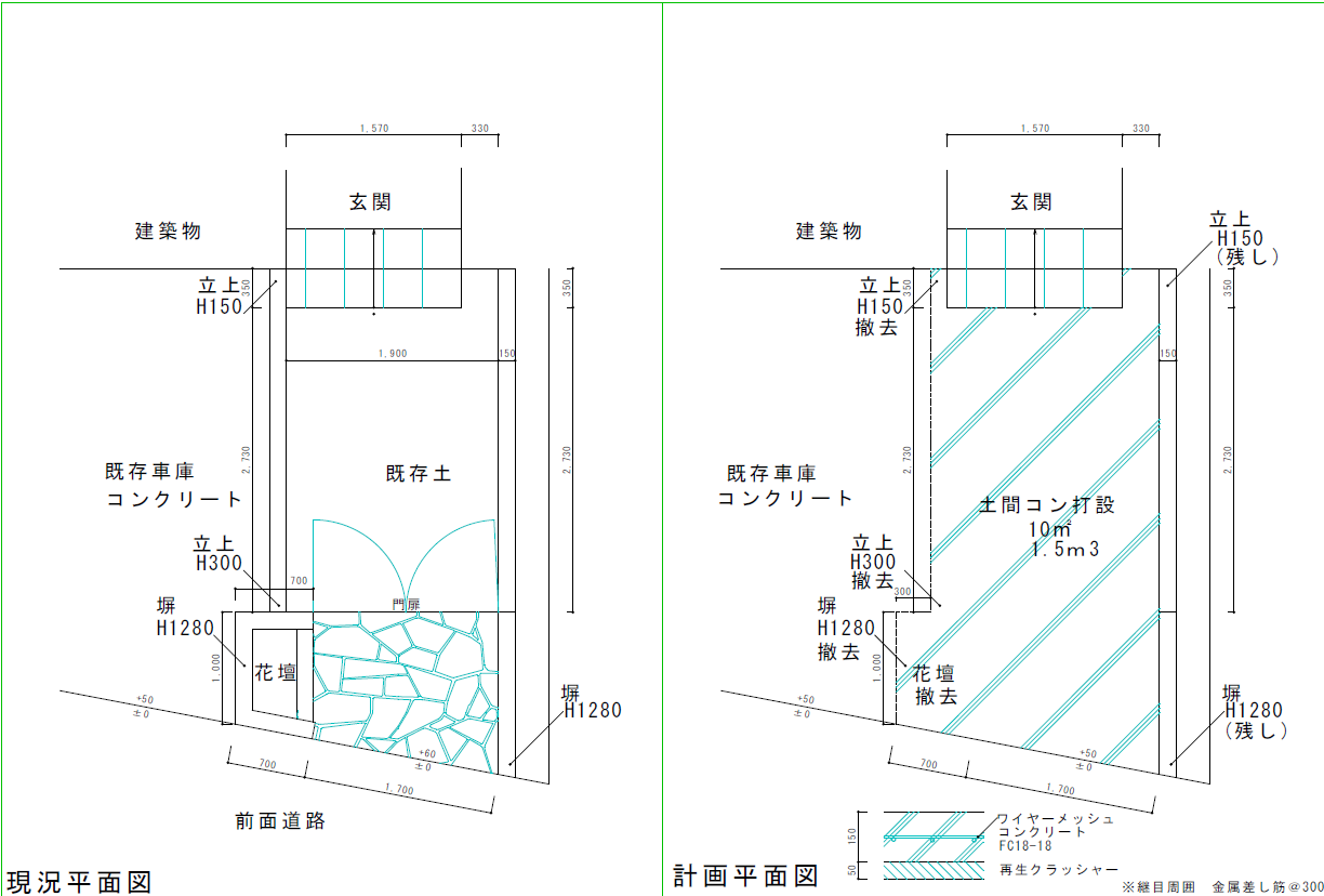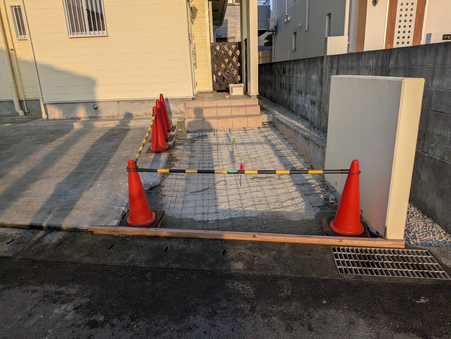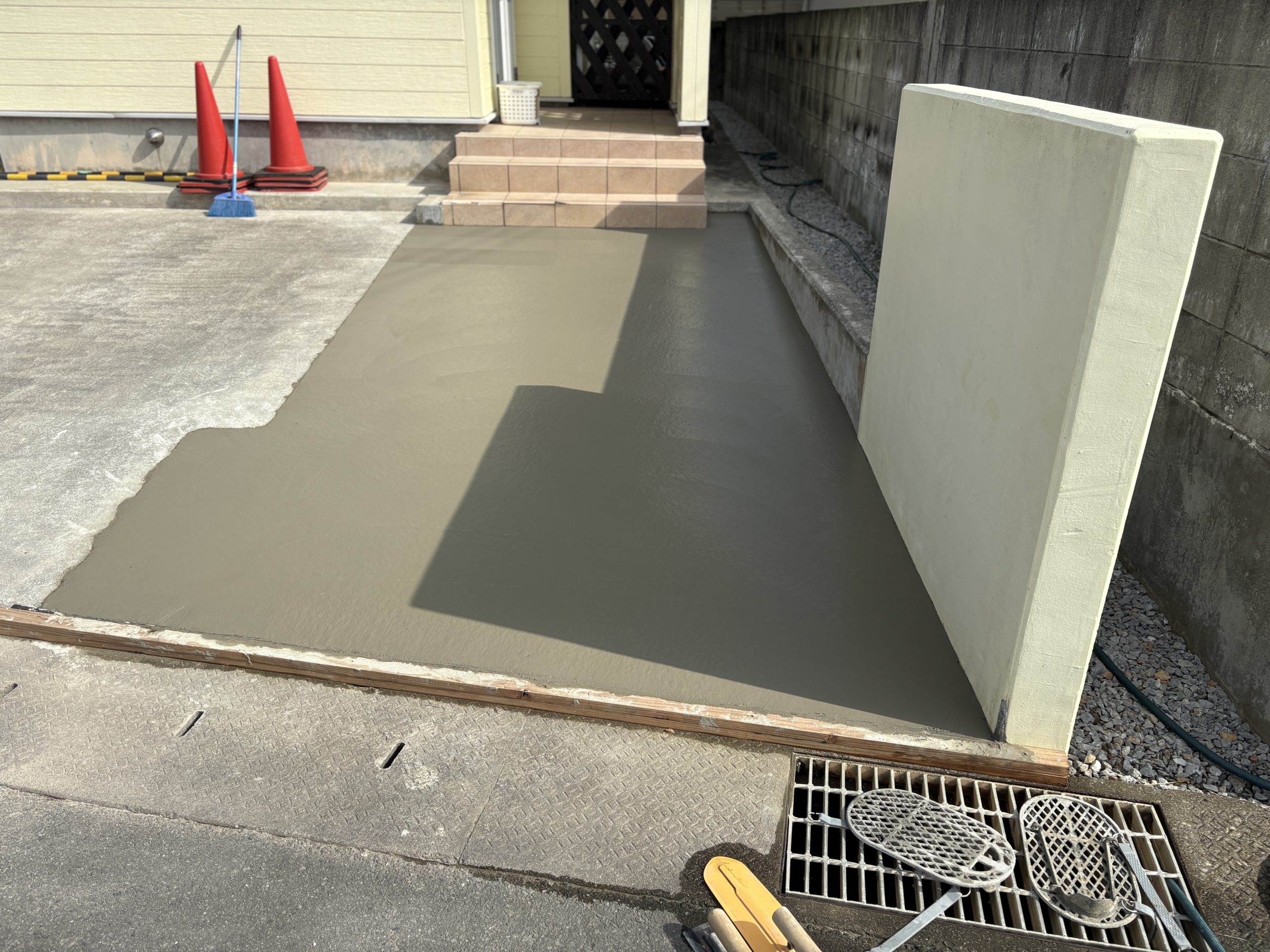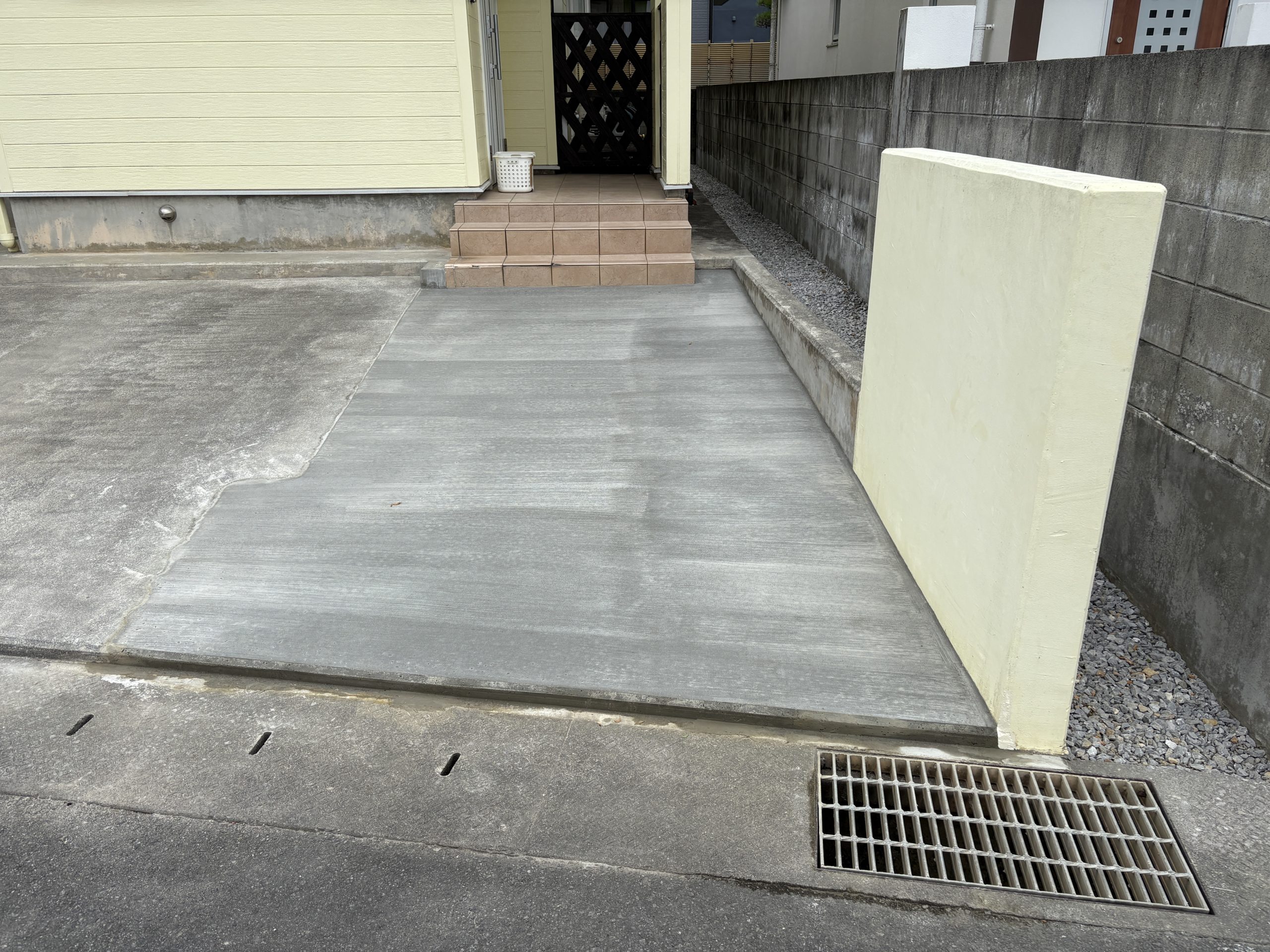 現在の駐車場は2台までしか停めれず、来月にもう一台車を購入するため、現在ある門扉,ポーチ部分を撤去し土間コンクリートをのばし駐車場を拡張する工事でした。 面積は約10㎡の拡張でした。