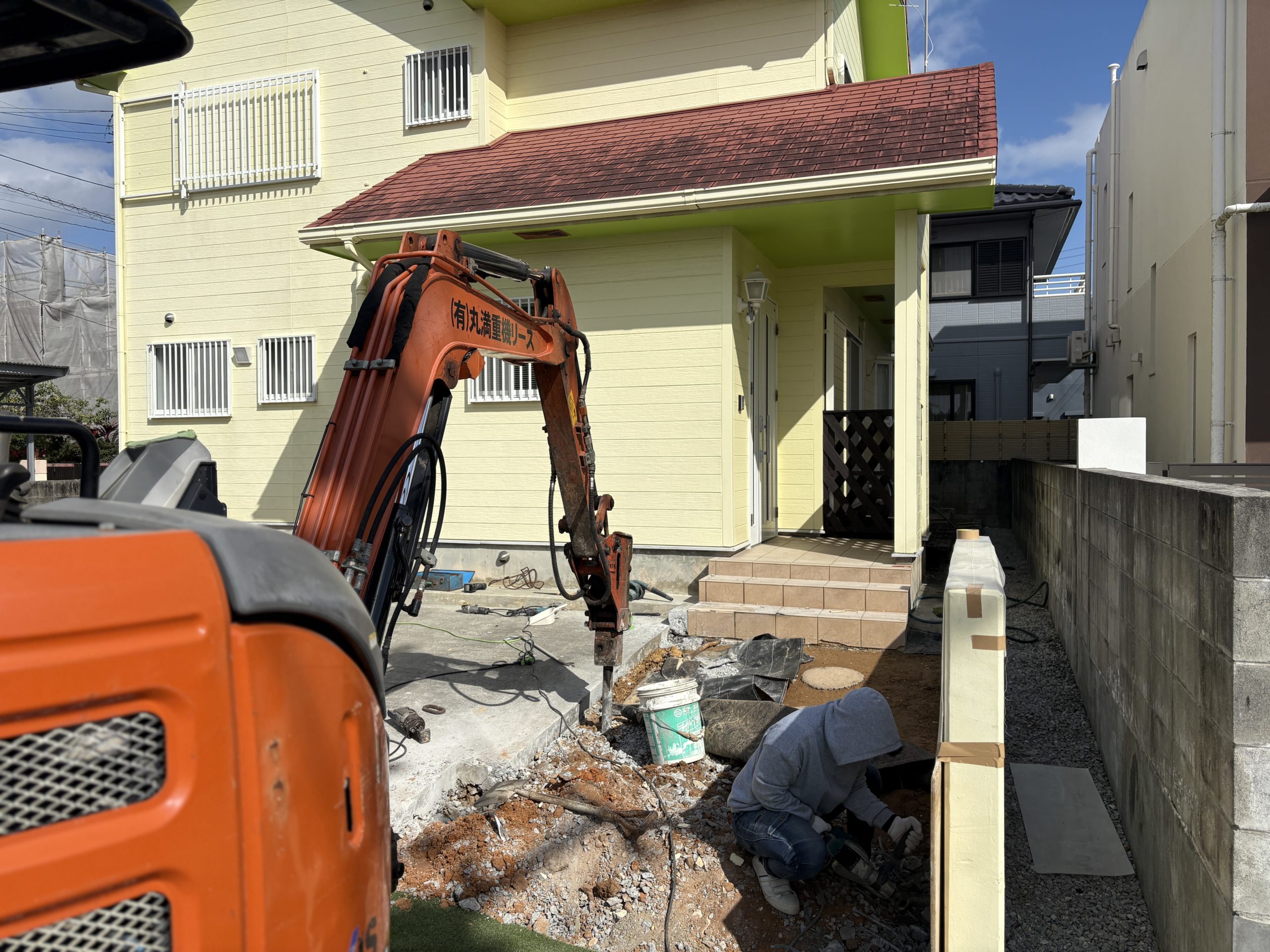 今回の工事は門扉やポーチの下に電気配線や水道配管がなかったのと、植栽もなかったため、工事がスムーズに進み